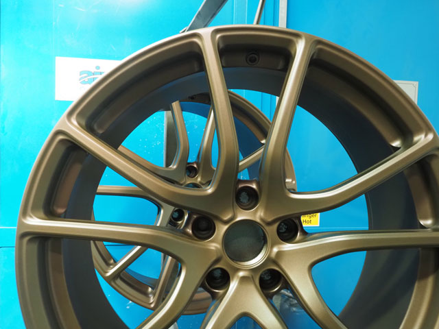 A powder coat primer is then applied, which is then cured before the basecoat colour of your choice is applied. We then apply an ultra durable powder coat lacquer; this enhances the look and protects the wheel. The wheel is then given a final cure for 20 minutes at 200°C